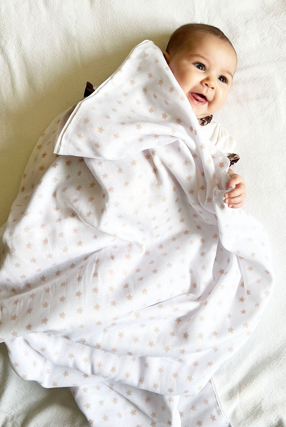 Muslin fabrics has long been recognized in the west as an ideal lightweight swaddle for babies, while providing added warmth during the cold winters and during the mild Summer, the cotton wicks the heat away from the body and allows for transpiration.